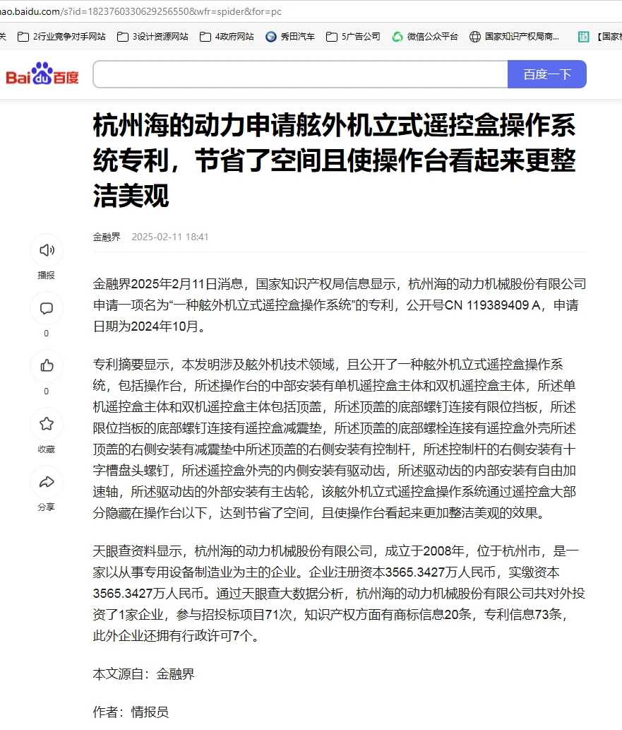 金融界2025年2月11日消息,国家知识产权局信息显示,杭州海的动力机械股份有限公司申请一项名为“一种舷外机立式遥控盒操作系统”的专利,公开号CN 119389409 A,申请日期为2024年10月。